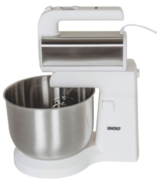5 Geschwindigkeitsstufen, zusätzliche Turbostufe, je 2 Rührquirle/Knethaken, automatisch rotierende Edelstahlschüssel 3,5 l