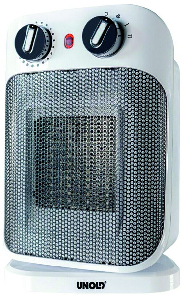 PTC-Keramik Heizelement, 4 Stufen: Aus, Ventilation, Warmluft, Heißluft; Ein-/Ausschalter, Betriebskontrollleuchte, Thermostat mit stufenloser Temperaturregelung, 70° oszillierend, Überhitzungsschutz, Kipp-Schutz/Auto off = Sicherheitsabschaltung, tropfwassergeschützt, Schutzklasse IP21 , Schutzklasse II, Tragegriff im Gehäuse