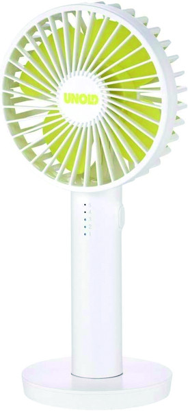 akkubetriebener Handventilator, magnetischer Standfuß mit integriertem Spiegel, 5-stufige Geschwindigkeitsregelung per Knopfdruck, LED-Kontrollleuchte, Li-Ion-Akku, Akkubetrieb je nach Stufe ca. 2 - 8 Stunden, Akkuladezeit ca. 3 Std., inklusive USB-Ladekabel