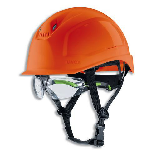 Der neue, leichte uvex pheos S-KR Schutzhelm mit vormontiertem 4-Punkt-Kinnriemen und kurzem Schirm im sportlichen Bergsteigerdesign bietet maximalen Tragekomfort durch die climazone-Belüftung und das Drehrad zur stufenlosen Weitenanpassung. Schutzbrillen und Schutzhelme vertragen sich nicht immer gut, dem aber setzt der uvex pheos IES jetzt ein Ende: IES heißt “Integrated Eyewear System“ und bedeutet, dass sich Ihre uvex pheos Arbeitsschutzbrille jetzt direkt mit dem im Helm integrierten Halter verbinden lässt. Damit sitzt sie jederzeit sicher dort, wo sie sitzen soll – bei Bedarf auch sicher verstaut in der Parkposition im Helm.