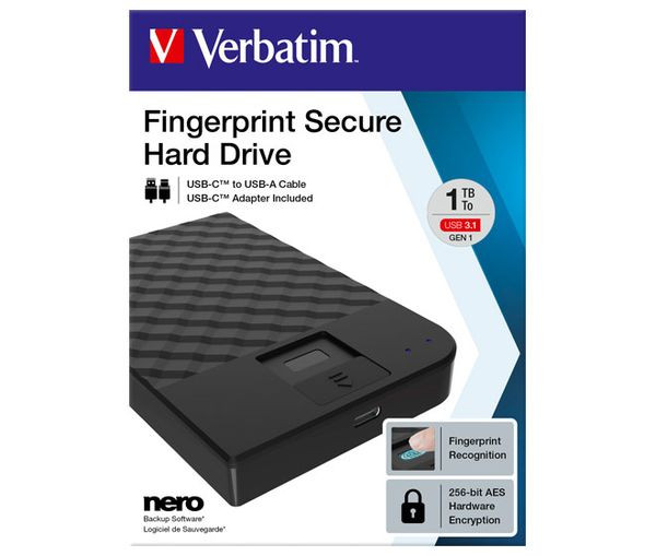 Verbatim Fingerprint Secure Tragbare Festplatte 1 TB - 1000 GB - 3.2 Gen 1 (3.1 Gen 1) - Schwarz2,5 ", 1.000 GB, USB 3.0, USB Typ C, Extern, Backup/Backed