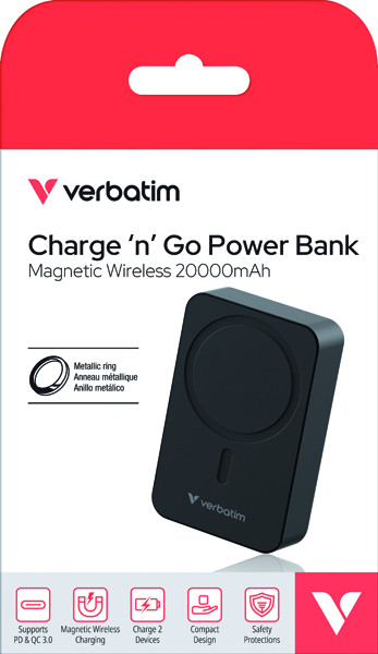 Kapazität: 20.000mAh, Technologie: Li-Polymer, Magnetic Wireless (15W), USB-C QC-PD 3.0 Eingang: 5V/2,4A, 9V/2,0 A (max. 35W), USB-C QC-PD 3.0 Ausgang: 5V/2,4A, 9V/2,22A, 12V/1,67A (max. 35W), USB-C Kabel, Farbe: schwarz, Abmessungen: 104 x 69 x 29mm, Gewicht: 351g.