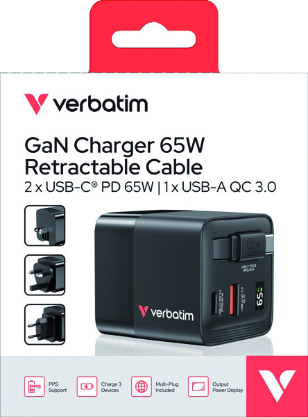 65W GaN Wandladegerät mit einziehbarem USB-C® PD 65W Kabel und 2 Ausgangsanschlüssen: 1 x USB-C PD 65W und 1 x USB-A QC 3.0, Lädt 3 Geräte gleichzeitig,Integrierte GaN-Technologie, Unterstützt superschnelles Laden mit USB Power Delivery 3.0, PPS und Quick Charge 3.0, Programmable Power Supply (PPS)-Technologie liefert die richtige Energiemenge für die ideale Ladung, Multistecker-Adapter für UK und EU im Lieferumfang enthalten, Ausgangsleistungsanzeige zeigt die Gesamtleistung für die Anschlüsse an, Kompaktes Design aus hochwertigen, schwer entflammbaren Materialien, Mit vier Sicherheitssystemen, einschließlich Überstromschutz, Überspannungsschutz, Kurzschlussschutz und Übertemperaturschutz, 2 Jahre beschränkte Garantie.