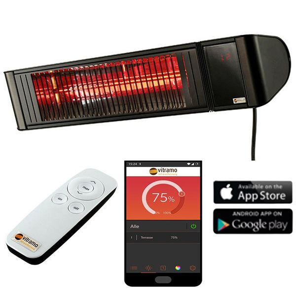 Dabei wird die erforderliche Wärmemenge ganz einfach per Bluetooth App oder Infrarot Fernbedienung reguliert. Mit der kostenlosen Smartphone App für iOS und Android ist der Heizstrahler stufenlos von 0 - 100% per touch dimmbar. Die Infrarot-Fernbedienung schaltet neben Ein/Aus das Gerät in sechs fein abgestimmten Heizstufen. Darüber hinaus können über Bluetooth App und Fernbedienung auch mehrere Infrarot-Heizstrahler (bis zu 6 Stück) parallel gesteuert werden. Das Heizgerät verfügt über einen eingebauten Ein/Aus-Hauptschalter am Gehäuse.