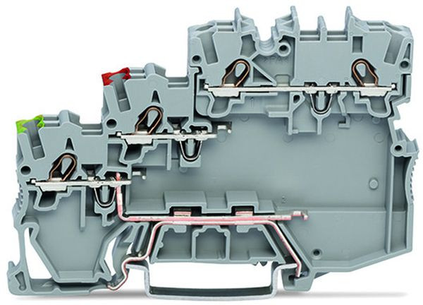 3-Leiter-Aktorenklemme; für NPN-(minus-)schaltende Aktoren; mit PE-Anschluss; mit farbig bedruckten Leitereinführungen; 1 mm²; Push-in CAGE CLAMP®; 1,00 mm²; grau