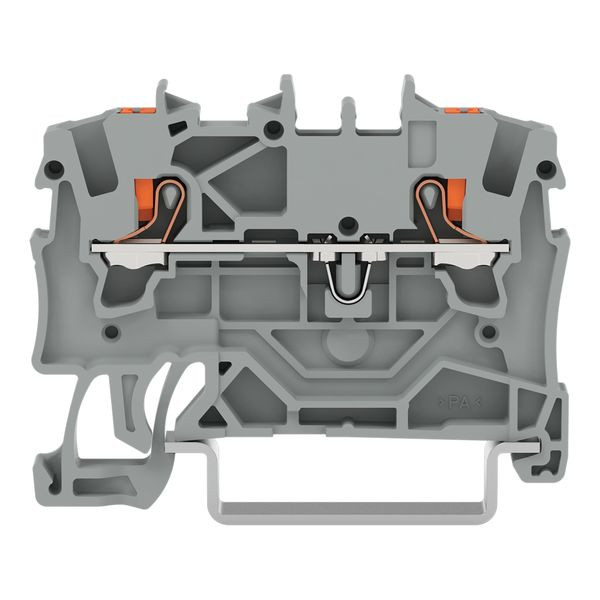 2-Leiter-Durchgangsklemme; mit Drücker; 1,5 mm²; mit Prüföffnung; seitliche und mittige Beschriftung; für Tragschiene 35 x 15 und 35 x 7,5; Push-in CAGE CLAMP®; 1,50 mm²; grau