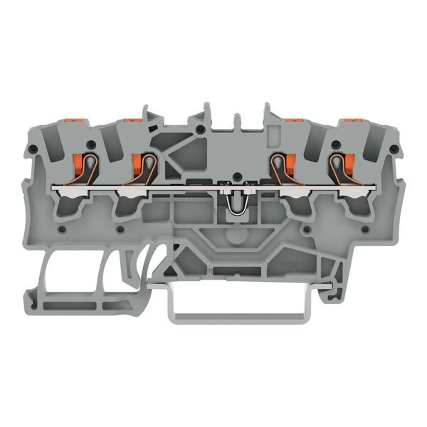 4-Leiter-Durchgangsklemme; mit Drücker; 1,5 mm²; mit Prüföffnung; seitliche und mittige Beschriftung; für Tragschiene 35 x 15 und 35 x 7,5; Push-in CAGE CLAMP®; 1,50 mm²; grau