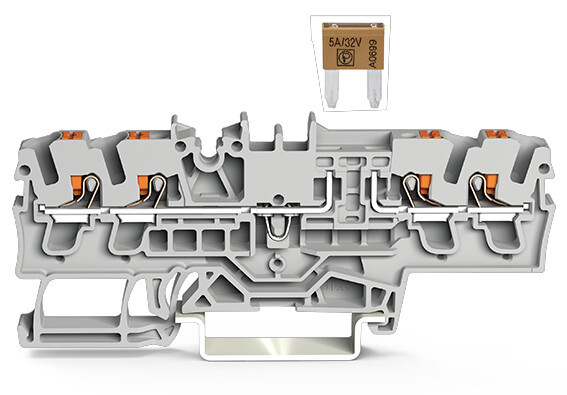 4-Leiter-Sicherungsklemme; für Kfz-Mini-Flachsicherungen; gemäß DIN 7258-3f, ISO 8820-3; mit Prüfmöglichkeit; mit Drücker; ohne Defektanzeige; 2,5 mm²; Push-in CAGE CLAMP®; grau