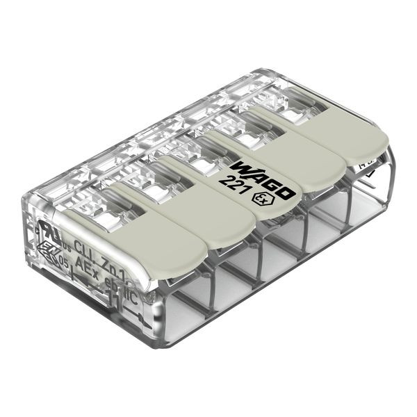 Verbindungsklemme mit Hebeln; für alle Leiterarten; für Anwendungen Ex e; max. 4 mm²; 5 Leiter; Gehäusefarbe transparent; Betriebstemperatur max. 105 °C; 4,00 mm²; transparent