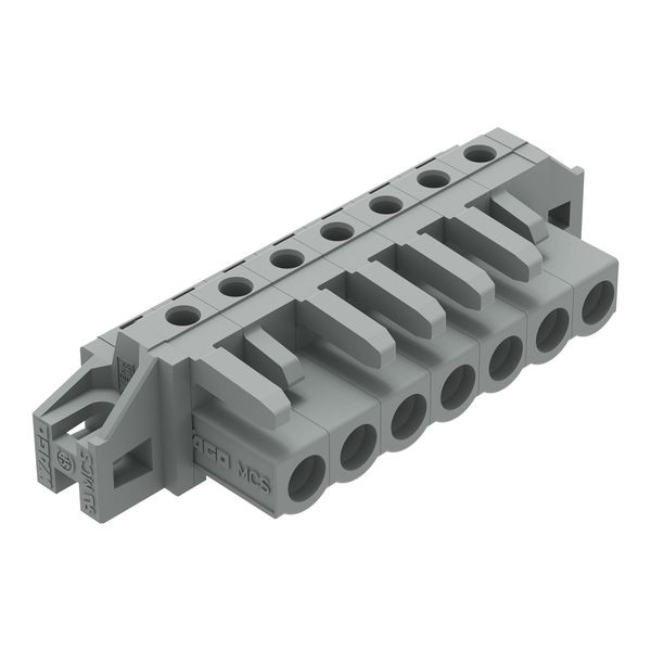 THT-Federleiste; abgewinkelt; Rastermaß 5 mm; 7-polig; Befestigungflansch; Lötstift 0,6 x 1,0 mm; grau