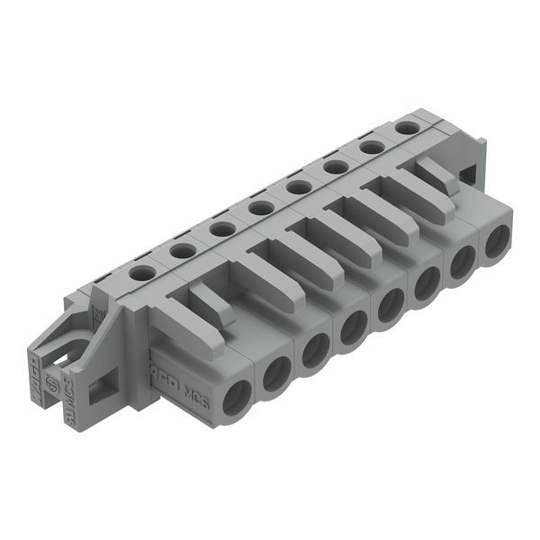 THT-Federleiste; abgewinkelt; Rastermaß 5 mm; 8-polig; Befestigungflansch; Lötstift 0,6 x 1,0 mm; grau