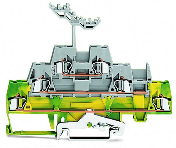 Dreistockklemme; Schirmleiter-/Durchgangs-/Durchgangsklemme; 2,5 mm²; mit Beschriftungsträger; für Tragschiene 35 x 15 und 35 x 7,5; CAGE CLAMP®; 2,50 mm²; grün-gelb/grau/grau