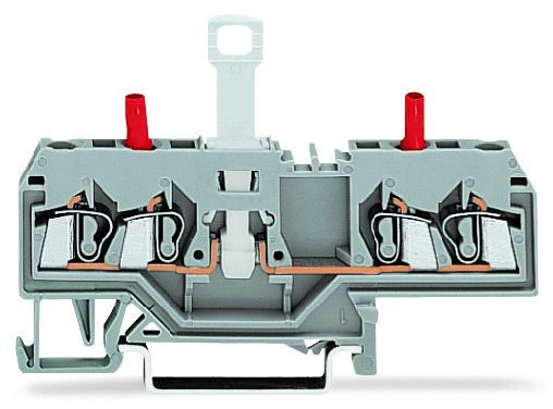 2-Leiter-Trenn- und Messklemme; ohne schwenkbaren Trennmesser; mit berührungssicheren Prüfbuchsen; Prüfbuchse rot; für Tragschiene 35 x 15 und 35 x 7,5; 2,5 mm²; CAGE CLAMP®; 2,50 mm²; grau