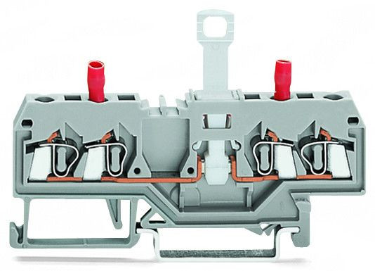 2-Leiter-Trenn- und Messklemme; ohne schwenkbaren Trennmesser; mit berührungssicheren Prüfbuchsen; Prüfbuchse rot; für Tragschiene 35 x 15 und 35 x 7,5; 2,5 mm²; CAGE CLAMP®; 2,50 mm²; grau