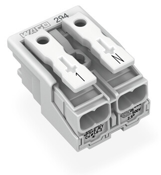 Leuchtenanschlussklemme; Drücker extern; ohne PE-Kontakt; 2-polig; Leuchtenseite: für eindrähtige Leiter; Inst.-Seite: für alle Leiterarten; max. 2,5 mm²; Umgebungstemperatur max. 85 °C (T85); weiß