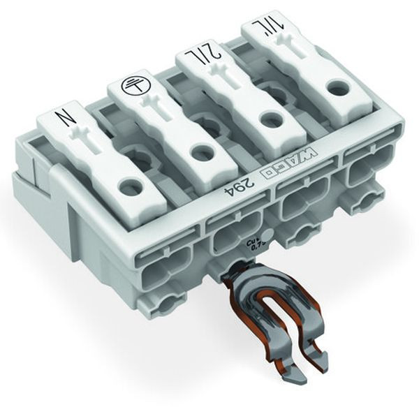 Leuchtenanschlussklemme; Drücker extern; mit abgewinkeltem PE-Rastkontakt; 1/L´-2/L-PE-N; 4-polig; Leuchtenseite: für eindrähtige Leiter; Inst.-Seite: für alle Leiterarten; max. 2,5 mm²; Umgebungstemperatur max. 85 °C (T85); weiß