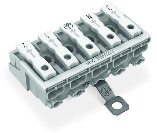 Leuchtenanschlussklemme; Drücker extern; mit PE-Schraubkontakt; 5-polig; Leuchtenseite: für eindrähtige Leiter; Inst.-Seite: für alle Leiterarten; max. 2,5 mm²; Umgebungstemperatur max. 85 °C (T85); weiß