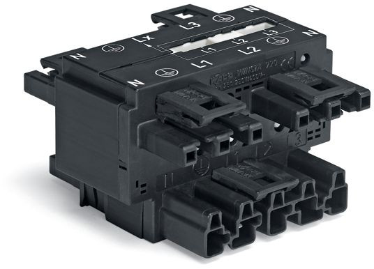 Verteiler Dreh- auf Wechselstrom; mit Phasenwechsel; 5-polig/3-polig; Kod. A; 1 Eingang; 5 Ausgänge; schwarz