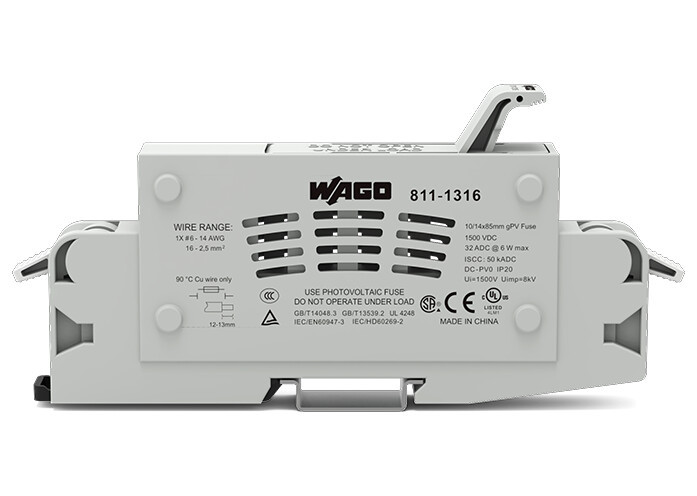 2-Leiter-Sicherungshalter; mit schwenkbarem Sicherungshalter; mit Prüfmöglichkeit; für Rundsicherungen 10/14 x 85 mm; für Photovoltaikanwendungen; 1-polig; DC 1500 V; für Tragschiene 35 x 15 und 35 x 7,5; 16 mm²; CAGE CLAMP®; lichtgrau