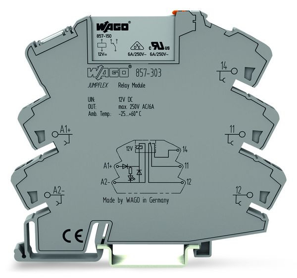Relaismodul; Eingangsnennspannung DC 12 V; 1 Wechsler; Grenzdauerstrom 6 A; Statusanzeige gelb; 6 mm Baubreite; 2,50 mm²; grau