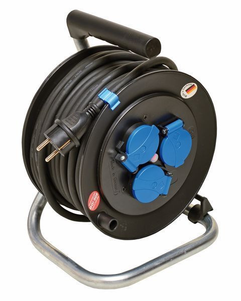 WALTHER Sicherheits-Kabeltrommel 230V mit Trommelkörper aus hochbruchfestem Spezialkunststoff stabiles, verzinktes Fußgestell mit geformten Haltegriff, Feststellbremse und LeitungsführungGesamtschutzart: IP44Bemessungsstrom: 16ALeistung bei aufgewickelter Leitung: 1500WLeistung bei abgewickelter Leitung: 3500WAbmessungen: 420 x 320 x 210mm (HxBxT) 320mm DurchmesserAnschluss:50m Gummischlauchleitung H07RN-F3G1,5 mit Schutzkontaktstecker entspricht BGI608 (DGUV-I 203-006)/K2 (BGI600) "- Gewerbe, Baustelle -"Abgänge:1 Thermoschutzschalter3 Schutzkontaktsteckdosen 16A 3P 230V mit Klappdeckel