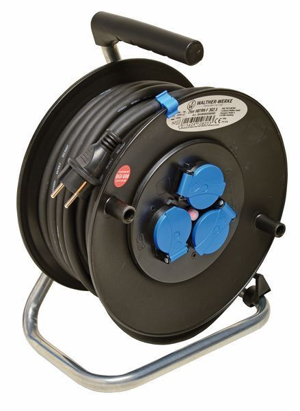 WALTHER Sicherheits-Kabeltrommel 230V mit Trommelkörper aus hochbruchfestem Spezialkunststoff stabiles, verzinktes Fußgestell mit geformten Haltegriff, Feststellbremse und LeitungsführungGesamtschutzart: IP44Bemessungsstrom: 16ALeistung bei aufgewickelter Leitung: 1500WLeistung bei abgewickelter Leitung: 3500WAbmessungen: 280 x 190 x 380mm (HxBxT) 285mm DurchmesserAnschluss:25m Gummischlauchleitung H07RN-F3G2,5 mit Schutzkontaktstecker entspricht BGI608 (DGUV-I 203-006)/K2 (BGI600) "- Gewerbe, Baustelle -"Abgänge:1 Thermoschutzschalter3 Schutzkontaktsteckdosen 16A 3P 230V mit Klappdeckel