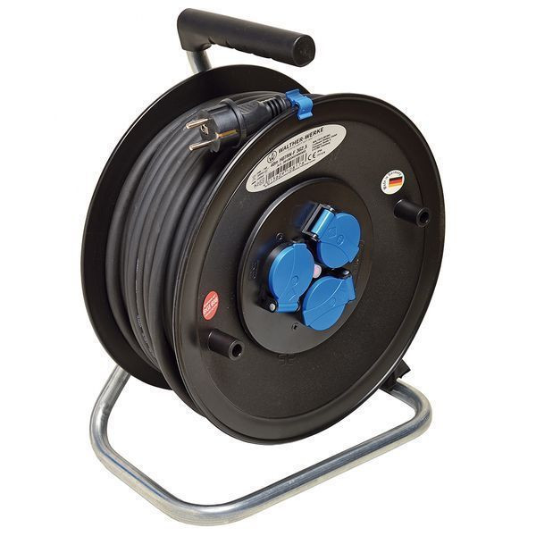 | Kurzbeschreibung | Sicherheits-Kabeltrommel 230V mit 3 Schutzk.-Steckdosen und Anschluss über 40m Gummischlauchleitung H07RN-F3G2,5 mit Schutzk.-Stecker |