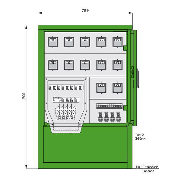 WALTHER Stromverteiler für FreizeitanlagenGehäuse aus Edelstahl (Werkstoff 1.4301)mit Lackierung RAL 6017 -maigrün-mit Bodenflanschplatte und innenliegenden Bohrungen zur Befestigungmit Einfachtür und 3-Punkt-Stangenschloss sowie Schwenkhebelmit Profilhalbzylinder, Schließung G2123sowie Kunststoff-RegenschutzkappeEinbauten bis einschl. RCD-Schutzschalter schutzisoliertvordere Blende zur Montage abnehmbarKabelausführung bei geschlossener Tür möglichSchutzart: IP 44Größe ca.: 1200 x 785 x 360mm / H-B-TAnschluss: 1 Klemmstein 2 x 5 x 10-50qmm Cu/AI für Zuleitung und KabelschleifeAbgang / Absicherung: 1 Lasttrennschalter mit Sicherungen 4P 63A D0212 RCD-Schutzschalter 2P 25A/30mA -A-12 mechanische WS-Zähler 10(30)A -neuwertig/beglaubigt-12 Abgangsklemmen 3 x 4qmm mit je 1 Leitungsschutzschalter (MCB) 1P 16A -B-