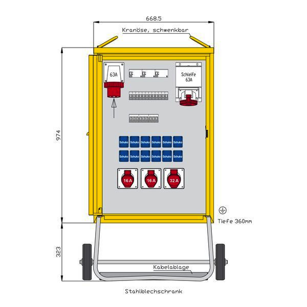 WALTHER Mobiler- Fest- und MarktplatzverteilerGehäuse (H08-F1) aus elektrolytisch-verzinktem Stahlblech mit schwermetallfreier Kunststoff-Lackierung Farbe: RAL 7032 -grau- mit Einfachtür, Federfallriegel für Vorhängeschloss und Griffmulde mit Kranösen inkl. feuerverzinktem UntergestellSchutzart : IP 44Größe ca.: 974 x 669 x 360mm / H-B-T + Untergestell-Höhe ca.: 323mm + Vollgummi-Bereifung und Kabelablage + SchiebebügelAnschluss: 1 CEE-Anbaugerätestecker 63A 5P 400V 6hAbgang / Absicherung: 1 CEE-Anbaudose 63A 5P 400V 6h als Kabelschleife 1 RCD-Schutzschalter 4P 63A/30mA -A- 1 CEE-Anbaudose 32A 5P 400V 6h mit Leitungsschutzschalter (MCB) 3P 32A -C- 2 CEE-Anbaudosen 16A 5P 400V 6h mit je 1 Leitungsschutzschalter (MCB) 3P 16A -C- 2 RCD-Schutzschalter 4P 40A/30mA -A-12 Schutzkontaktsteckdosen 16A 2P 230V mit je 1 Leitungsschutzschalter (MCB) 1P 16A -C-