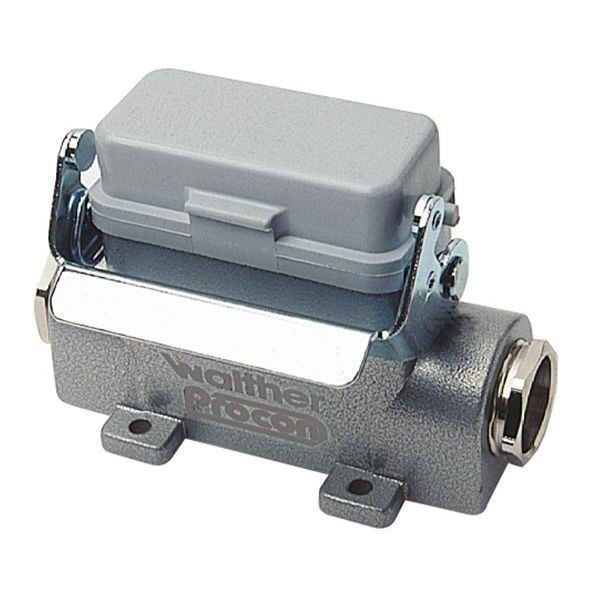 WALTHER SockelgehäuseAluminium-Druckguss Gehäuse der Höhe 52mm mit Längsverriegelungsbügel aus verzinktem Stahl mit einem M20 Stutzen und Klappdeckel aus KunststoffSchutzart: IP65für die Baureihen A10 und D15