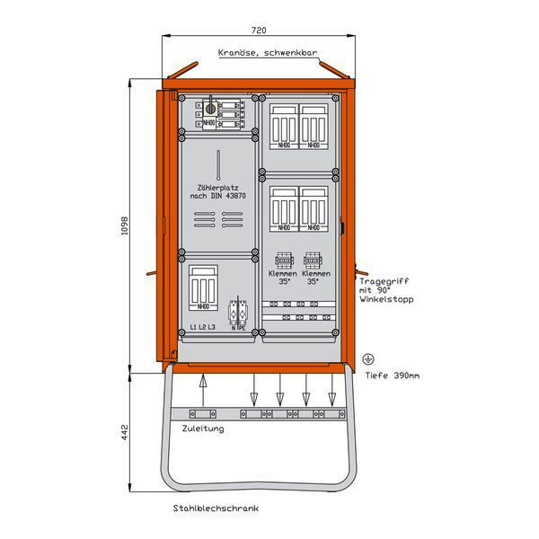 WALTHER AnschlussschrankAnschlussleistung: bis 69kVAnach IEC61439-4und DIN/VDE 43868/1Gehäuse (H26) aus elektrolytisch-verzinktem Stahlblech mit schwermetallfreier Kunststoff-Lackierung Farbe: RAL 2004 -reinorange- mit Einfachtür, Federfallriegel für Vorhängeschloss und Griffmulde mit Kranösen und seitlichen Tragegriffen inkl. feuerverzinktem Untergestell mit Ösen für ErdnägelEinbauten im IsolierstoffgehäuseSchutzart : IP 44Messeinrichtung Schutzart : IP 54Größe ca.: 1098 x 720 x 390mm / H-B-T + Untergestell-Höhe ca.: 442mmAnschluss:1 NH00-Sicherungslasttrennschalter 100A mit Bügelklemmen 10-50qmmMessung:1 DS-Zählerplatz ohne Zähler nach DIN 43 870/2Abgang / Absicherung:1 NH00-Lasttrennschalter mit Trennmesser xxxA2 NH00-Sicherungslasttrennschalter 80A mit je 1 Bügelklemme 10-50qmm2 NH00-Sicherungslasttrennschalter 80A mit je 1 Reihenklemme bis 35qmm