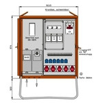 | Kurzbeschreibung | Anschlussverteilerschrank 69kVA mit Zählerplatz, 2 RCDs Typ B und RCD Typ A, 11 LS, 6 CEE-Abgänge 16-63A und 6 Schukos |