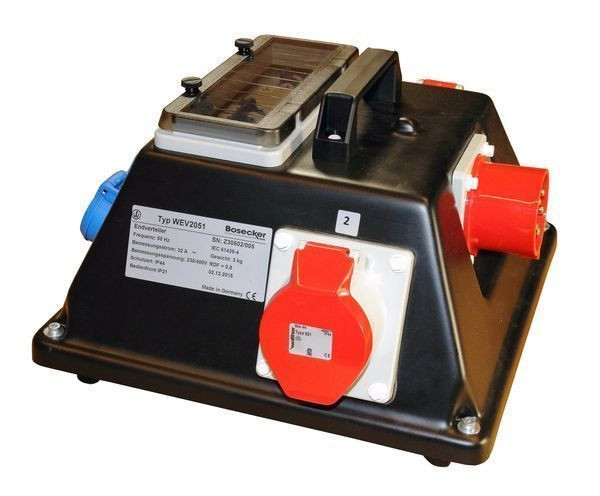 WALTHER SteckdosenverteilerAnschlussleistung: 22kVAnach IEC61439-4Gehäuse aus Hart-Polyäthylen Hochwärme- und UV-beständig Stoß- und schlagfest Farbe: -schwarz- mit Tragegriff RCD-Schutzschalter und Leitungsschutzschalter (MCB) unterBetätigungsklappe schutzisoliertSchutzart: IP 44Größe ca.: 185 x 342 x 356mm / H-B-T Anschluss:1 CEE-Anbaugerätestecker 32A 5P 400V 6hAbgang / Absicherung:1 RCD-Schutzschalter 4P 40A/30 mA -A-2 CEE-Anbaudosen 32A 5P 400V 6h3 Schutzkontaktsteckdosen 16A 2P 230V mit je 1 Leitungsschutzschalter (MCB) 1P 16A -B-