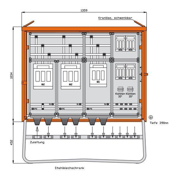 Sicherungslasttrennschalter 4 x NH00/ 1x NH1/NH2 WALTHER GruppenverteilerschrankAnschlussleistung: 277kVAnach IEC61439-4Gehäuse (H30) aus elektrolytisch-verzinktem Stahlblech mit schwermetallfreier Kunststoff-Lackierung Farbe: RAL 2004 -reinorange- mit Kranösen mit Doppeltür und 3-Punkt Stangenschloss mit Drehknauf und Vorrichtung für Vorhängeschloss inkl. feuerverzinktem Untergestell mit Ösen für ErdnägelEinbauten im IsolierstoffgehäuseSchutzart : IP 44Größe ca.: 1034 x 1359 x 390mm / H-B-T + Untergestell-Höhe ca.: 452mmAnschluss:1 NH2-Sicherungslasttrennschalter 400A mit Bolzenanschluss M101 CU-Sammelschienensystem 400AAbgang / Absicherung:1 NH2-Sicherungslasttrennschalter 355A mit Bolzenanschluss M101 NH1-Sicherungslasttrennschalter 250A mit Bolzenanschluss M102 NH00-Sicherungslasttrennschalter 100A mit je 1 Bügelklemme 10-50qmm2 NH00-Sicherungslasttrennschalter 100A mit je 1 Reihenklemme bis 35qmm