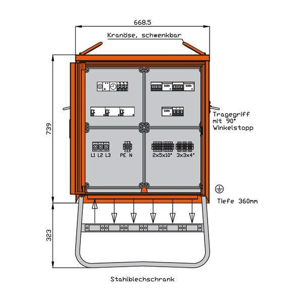 WALTHER BeleuchtungsverteilerschrankAnschlussleistung: 35kVAnach IEC61439-4Gehäuse (H06BE) aus elektrolytisch-verzinktem Stahlblech mit schwermetallfreier Kunststoff-Lackierung Farbe: RAL 2004 -reinorange- mit Einfachtür, Federfallriegel für Vorhängeschloss und Griffmulde mit Kranösen und seitlichen Tragegriffen inkl. feuerverzinktem Untergestell mit Ösen für Erdnägel Einbauten bis einschließlich RCD-Schutzschalter im IsolierstoffgehäuseSchutzart: IP 44Größe ca.: 739 x 669 x 360mm / H-B-T + Untergestell-Höhe ca.: 323mmAnschluss:1 Lasttrennschalter mit Sicherungen 3P 50A D02 mit Zugangsklemme 1 x 5 x 35qmmAbgang / Absicherung:1 Sicherungselement 1P 6A D01 -als Steuersicherung- 1 Dämmerungsschalter mit sep. Lichtfänger 1 digitale Zeitschaltuhr 2 RCD-Schutzschalter 4P 40A/30mA2 H-O-A-Schalter2 Schütze 3P 20A 2 Leitungsschutzschalter (MCB) 3P 16A -C- mit je 1 Abgangsklemme 5 x 10qmm 1 RCD-Schutzschalter 4P 40A/30mA1 H-O-A-Schalter1 Schütz 3P 20A 3 Leitungsschutzschalter (MCB) 1P 16A -B- mit je 1 Abgangsklemme 3 x 4qmm