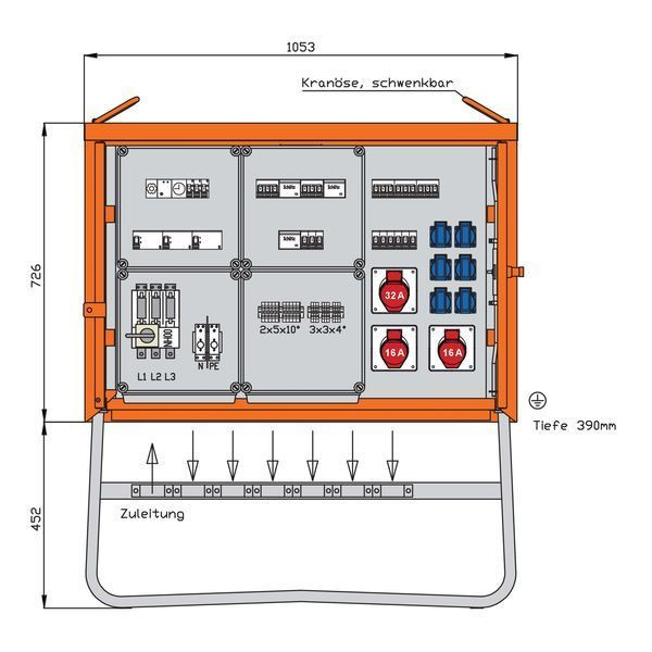 WALTHER BeleuchtungsverteilerAnschlussleistung: 44kVAnach IEC61439-4Gehäuse (H28BE) aus elektrolytisch-verzinktem Stahlblech mit schwermetallfreier Kunststoff-Lackierung Farbe: RAL 2004 -reinorange- mit Kranösen mit Doppeltür und 3-Punkt Stangenschloss mit Drehknauf und Vorrichtung für Vorhängeschloss inkl. feuerverzinktem Untergestell mit Ösen für ErdnägelEinbauten bis einschließlich RCD-Schutzschalter im IsolierstoffgehäuseSchutzart: IP 44Größe ca.: 726 x 1053 x 390mm / H-B-T + Untergestell-Höhe ca.: 452mmAnschluss:1 NH00-Lasttrennschalter mit Sicherungen 63A mit Bügelklemmen 10-50qmmAbgang / Absicherung:1 RCD-Schutzschalter 4P 63A/30mA -B-1 CEE-Anbaudose 32A 5P 400V 6h mit Leitungsschutzschalter (MCB) 3P 32A -C-2 CEE-Anbaudosen 16A 5P 400V 6h mit je 1 Leitungsschutzschalter (MCB) 3P 16A -C-1 RCD-Schutzschalter 4P 40A/30mA -A-6 Schutzkontaktsteckdosen 16A 2P 230V mit je 1 Leitungsschutzschalter (MCB) 1P 16A -C- 1 RCD-Schutzschalter 4P 63A/30mA -A-1 Sicherungselement 1P 6A D01 -als Steuersicherung- 1 Dämmerungsschalter mit sep. Lichtfänger 1 digitale Zeitschaltuhr 2 H-O-A-Schalter2 Schütze 3P 20A 2 Leitungsschutzschalter (MCB) 3P 16A -C- mit je 1 Abgangsklemme 5 x 10qmm1 H-O-A-Schalter1 Schütz 3P 20A 3 Leitungsschutzschalter (MCB) 1P 16A -B- mit je 1 Abgangsklemme 3 x 4qmm