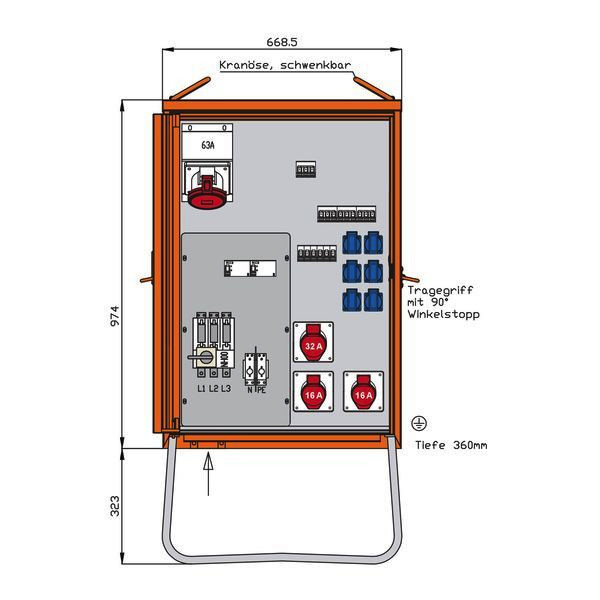 WALTHER VerteilerschrankAnschlussleistung: 55kVAnach IEC61439-4Gehäuse (H08) aus elektrolytisch-verzinktem Stahlblech mit schwermetallfreier Kunststoff-Lackierung Farbe: RAL 2004 -reinorange- mit Einfachtür, Federfallriegel für Vorhängeschloss und Griffmulde mit Kranösen und seitlichen Tragegriffen inkl. feuerverzinktem Untergestell mit Ösen für Erdnägel Einbauten bis einschließlich RCD-Schutzschalter im IsolierstoffgehäuseSchutzart: IP 44Größe ca.: 974 x 669 x 360mm / H-B-T + Untergestell-Höhe ca.: 323mmAnschluss:1 Leistungsschalter 3P 80A mit thermisch-magnetischem Auslöser mit Rahmenklemmen 10-50 mm²Abgang / Absicherung:1 RCD-Schutzschalter 4P 63A/30mA -B- mit Leitungsschutzschalter (MCB) 3P 63A -D-1 CEE-Anbaudose 63A 5P 400V 6h ohne Vorsicherung -direkt ab RCD-1 CEE-Anbaudose 32A 5P 400V 6h mit Leitungsschutzschalter (MCB) 3P 32A -C-2 CEE-Anbaudosen 16A 5P 400V 6h mit je 1 Leitungsschutzschalter (MCB) 3P 16A -C-1 RCD-Schutzschalter 4P 40A/30mA -A-6 Schutzkontaktsteckdosen 16A 2P 230V mit je 1 Leitungsschutzschalter (MCB) 1P 16A -C-