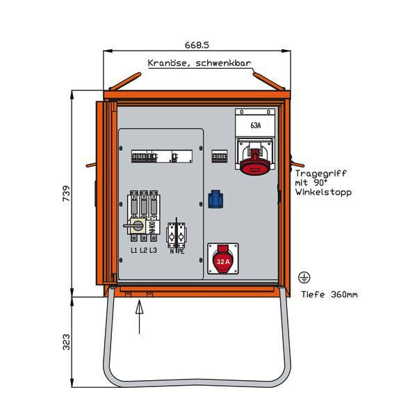WALTHER VerteilerschrankAnschlussleistung: 69kVAnach IEC61439-4Gehäuse (H06) aus elektrolytisch-verzinktem Stahlblech mit schwermetallfreier Kunststoff-Lackierung Farbe: RAL 2004 -reinorange- mit Einfachtür, Federfallriegel für Vorhängeschloss und Griffmulde mit Kranösen und seitlichen Tragegriffen inkl. feuerverzinktem Untergestell mit Ösen für Erdnägel Einbauten bis einschließlich RCD-Schutzschalter im IsolierstoffgehäuseSchutzart: IP 44Größe ca.: 739 x 669 x 360mm / H-B-T + Untergestell-Höhe ca.: 323mmAnschluss:1 Leistungsschalter 3P 100A mit thermisch-magnetischem Auslöser mit Rahmenklemmen 10-50 mm²Abgang / Absicherung:1 RCD-Schutzschalter 4P 63A/300mA -B-1 CEE-Anbaudose 63A 5P 400V 6h mit Leitungsschutzschalter (MCB) 3P 50A -D-1 RCD-Schutzschalter 4P 40A/30mA -B- mit Leitungsschutzschalter (MCB) 3P 32A -C-1 CEE-Anbaudose 32A 5P 400V 6h ohne Vorsicherung -direkt ab RCD-1 Schutzkontaktsteckdose 16A 2P 230V mit Leitungsschutzschalter (MCB) 1P 16A -C-