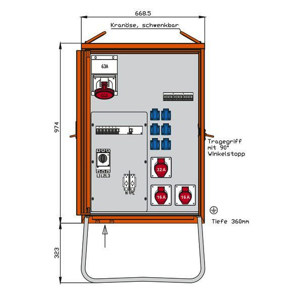 WALTHER VerteilerschrankAnschlussleistung: 44kVAnach IEC61439-4Gehäuse (H08) aus elektrolytisch-verzinktem Stahlblech mit schwermetallfreier Kunststoff-Lackierung Farbe: RAL 2004 -reinorange- mit Einfachtür, Federfallriegel für Vorhängeschloss und Griffmulde mit Kranösen und seitlichen Tragegriffen inkl. feuerverzinktem Untergestell mit Ösen für Erdnägel Einbauten bis einschließlich RCD-Schutzschalter im IsolierstoffgehäuseSchutzart: IP 44Größe ca.: 974 x 669 x 360mm / H-B-T + Untergestell-Höhe ca.: 323mmAnschluss:1 Leistungsschalter 3P 63A mit thermisch-magnetischem Auslöser mit Rahmenklemmen 10-50 mm²Abgang / Absicherung:1 RCD-Schutzschalter 4P 63A/300mA -B-1 CEE-Anbaudose 63A 5P 400V 6h ohne Vorsicherung -direkt ab RCD-1 RCD-Schutzschalter 4P 63A/30mA -B-1 CEE-Anbaudose 32A 5P 400V 6h mit Leitungsschutzschalter (MCB) 3P 32A -C-2 CEE-Anbaudosen 16A 5P 400V 6h mit je 1 Leitungsschutzschalter (MCB) 3P 16A -C-6 Schutzkontaktsteckdosen 16A 2P 230V mit je 1 Leitungsschutzschalter (MCB) 1P 16A -C-