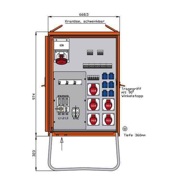 WALTHER VerteilerschrankAnschlussleistung: 69kVAnach IEC61439-4Gehäuse (H08) aus elektrolytisch-verzinktem Stahlblech mit schwermetallfreier Kunststoff-Lackierung Farbe: RAL 2004 -reinorange- mit Einfachtür, Federfallriegel für Vorhängeschloss und Griffmulde mit Kranösen und seitlichen Tragegriffen inkl. feuerverzinktem Untergestell mit Ösen für Erdnägel Einbauten bis einschließlich RCD-Schutzschalter im IsolierstoffgehäuseSchutzart: IP 44Größe ca.: 974 x 669 x 360mm / H-B-T + Untergestell-Höhe ca.: 323mmAnschluss:1 Leistungsschalter 3P 100A mit thermisch-magnetischem Auslöser mit Rahmenklemmen 10-50 mm²Abgang / Absicherung:1 RCD-Schutzschalter 4P 63A/300mA -B-1 CEE-Anbaudose 63A 5P 400V 6h mit Leitungsschutzschalter (MCB) 3P 63A -C-1 RCD-Schutzschalter 4P 63A/30mA -B- mit Leitungsschutzschalter (MCB) 3P 63A -D-2 CEE-Anbaudosen 32A 5P 400V 6h mit je 1 Leitungsschutzschalter (MCB) 3P 32A -C-3 CEE-Anbaudosen 16A 5P 400V 6h mit je 1 Leitungsschutzschalter (MCB) 3P 16A -C-1 RCD-Schutzschalter 4P 40A/30mA -A-6 Schutzkontaktsteckdosen 16A 2P 230V mit je 1 Leitungsschutzschalter (MCB) 1P 16A -C-