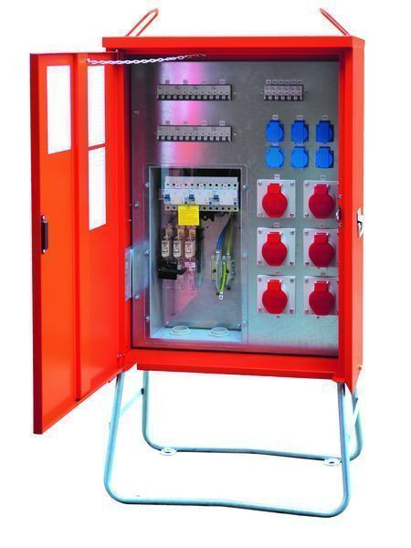 WALTHER Verteilerschrank für ContainerAnschlussleistung: 69kVAnach IEC61439-4Gehäuse (H08) aus elektrolytisch-verzinktem Stahlblech mit schwermetallfreier Kunststoff-Lackierung Farbe: RAL 2004 -reinorange- mit Einfachtür, Federfallriegel für Vorhängeschloss und Griffmulde mit Kranösen und seitlichen Tragegriffen inkl. feuerverzinktem Untergestell mit Ösen für Erdnägel Einbauten bis einschließlich RCD-Schutzschalter im IsolierstoffgehäuseSchutzart: IP 44Größe ca.: 974 x 669 x 360mm / H-B-T + Untergestell-Höhe ca.: 323mmAnschluss:1 Leistungsschalter 3P 100A mit thermisch-magnetischem Auslöser mit Rahmenklemmen 10-50 mm²Abgang / Absicherung:2 RCD-Schutzschalter 4P 63A/30mA -B- mit je 1 Leitungsschutzschalter (MCB) 3P 63A -D-6 CEE-Anbaudosen 32A 5P 400V 6h mit je 1 Leitungsschutzschalter (MCB) 3P 32A -C-1 RCD-Schutzschalter 4P 40A/30mA -A-6 Schutzkontaktsteckdosen 16A 2P 230V mit je 1 Leitungsschutzschalter (MCB) 1P 16A -C-