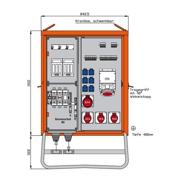 WALTHER VerteilerschrankAnschlussleistung: 138kVAnach IEC61439-4Gehäuse (H22) aus elektrolytisch-verzinktem Stahlblech mit schwermetallfreier Kunststoff-Lackierung Farbe: RAL 2004 -reinorange- mit Einfachtür, Federfallriegel für Vorhängeschloss und Griffmulde mit Kranösen und seitlichen Tragegriffen inkl. feuerverzinktem Untergestell mit Ösen für Erdnägel Einbauten bis einschließlich RCD-Schutzschalter im IsolierstoffgehäuseSchutzart: IP 44Größe ca.: 1012 x 843 x 480mm / H-B-T + Untergestell-Höhe ca.: 322mmAnschluss:1 NH1-Lasttrennschalter mit Sicherungen 200A mit Bolzenanschluss M10Abgang / Absicherung:1 RCD-Schutzschalter 4P 125A/500mA -B- mit NH00-Sicherungslasttrennschalter 100A1 CEE-Anbaudose 125A 5P 400V 6h ohne Vorsicherung -direkt ab RCD-1 CEE-Anbaudose 63A 5P 400V 6h mit Leitungsschutzschalter (MCB) 3P 50A -D-1 NH00-Sicherungslasttrennschalter 100A1 RCD-Schutzschalter 4P 63A/30mA -B- mit Leitungsschutzschalter (MCB) 3P 50A -C-1 CEE-Anbaudose 32A 5P 400V 6h mit Leitungsschutzschalter (MCB) 3P 32A -C-2 CEE-Anbaudosen 16A 5P 400V 6h mit je 1 Leitungsschutzschalter (MCB) 3P 16A -C-1 RCD-Schutzschalter 4P 40A/30mA -A-6 Schutzkontaktsteckdosen 16A 2P 230V mit je 1 Leitungsschutzschalter (MCB) 1P 16A -C-