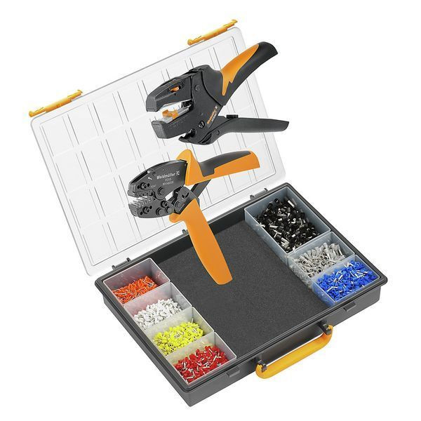 Sortimentskasten mit Crimpwerkzeug, Abisolierwerkzeug und Aderendhülsen zum Schneiden, Abisolieren und Crimpen. Aus dem gut geordneten Sortiment, resultieren minimierte Such- und Vorbereitungszeiten.