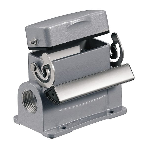 | Kurzbeschreibung | Gehäuse Industriesteckverbinder, Sockelgehäuse, Längsbügel am Unterteil, Baugröße: 2, IP65, im gestecktem Zustand |