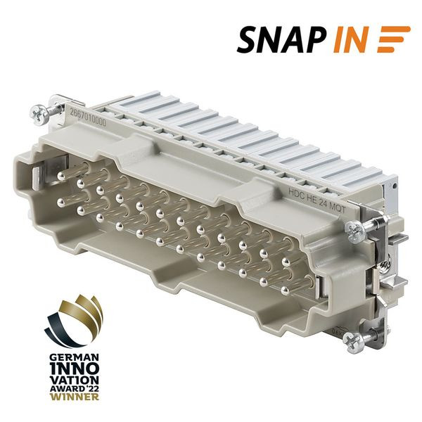 | Kurzbeschreibung | Kontakteinsatz (Industriesteckverbinder), Stift, 500 V, 16 A, Polzahl: 24, SNAP IN, Baugröße: 8 |