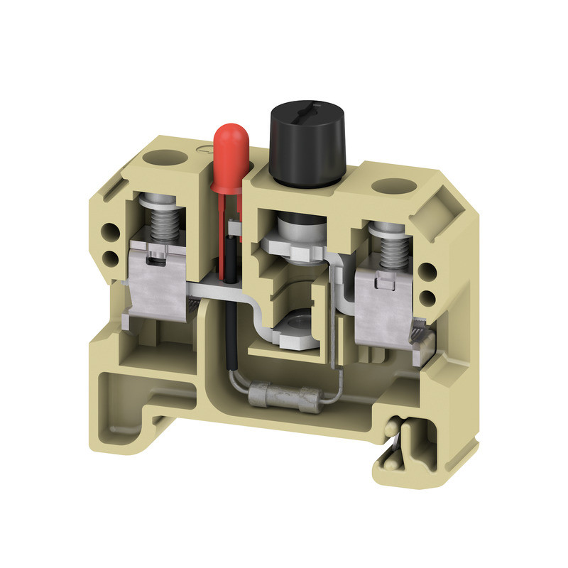 Reihenklemme zum Anschließen oder Verbinden von Leitern mit dauerhaft sicherem Kontakt. Gehärteter Stahl hält den mechanischen Kräften stand, Zinn-beschichtetes Kupfer sorgt für beste Leitfähigkeit. Mit herausnehmbarem Träger für einen Sicherungseinsatz.