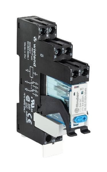 Steckbares Koppel-Relais flare MOVE MR, Spulenspg. 24V DC, 2 Wechslerkontakte 440V AC / 8A, AgNi+5µm Gold, Baubreite 15,8mm, mech. Schaltstellungsanzeige, Blockierbare Prüftaste, incl, Anzeigemodul mit LED und Freilaufdiode, incl. Haltebügel, Schraubanschluss, auch für Bahnanwendung nach EN 50 155