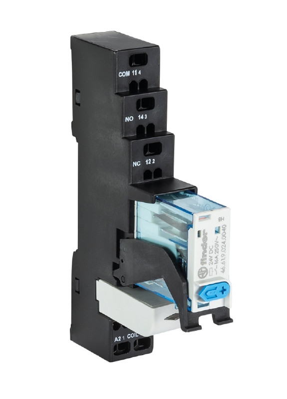 Steckbares Koppel-Relais flare MOVE MR, Spulenspg. 24V DC, 1 Wechslerkontakt 400V AC / 10A, AgNi+5µm Gold, Baubreite 15,8mm, mech. Schaltstellungsanzeige, Blockierbare Prüftaste, incl. Anzeigemodul mit LED und Freilaufdiode, incl. Haltebügel, Federkraftanschluss, auch für Bahnanwendung nach EN 50 155
