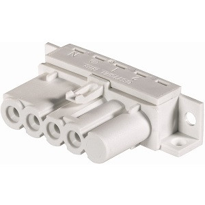 GST15i4 Geräteanschluss, Lötteil, horizontal mit Befestigungsflansch, im 5-poligen Gehäuse, Polzahl 4, Ausführung Buchse, Anschlussart Lötanschluss, Bemessungsspannung 250 V / 400 V, Bemessungsstrom 16 A, Codierfarbe / Kontakteinsatz weiß