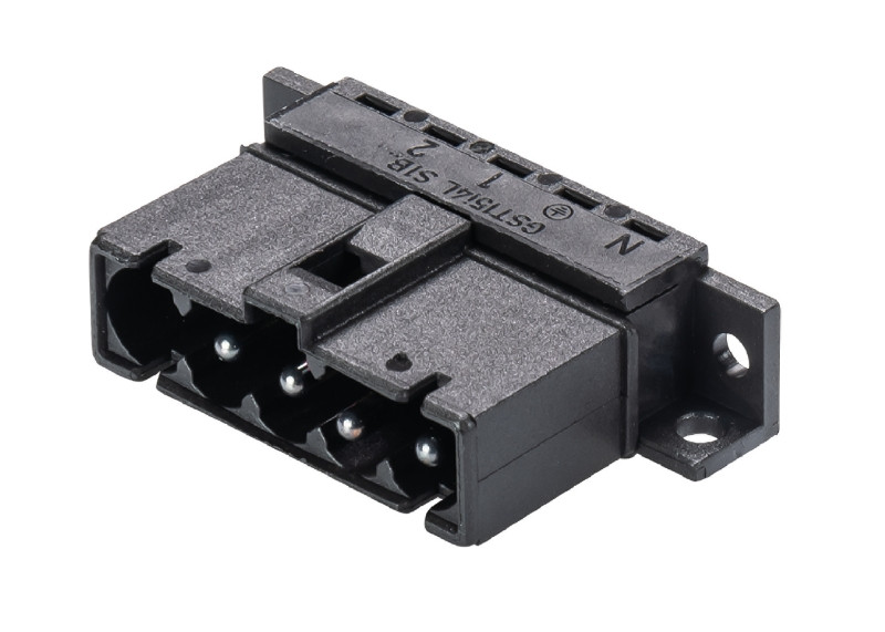 GST15i4 Geräteanschluss, Lötteil, horizontal mit Befestigungsflansch, im 5-poligen Gehäuse, Polzahl 4, Ausführung Stecker, Anschlussart Lötanschluss, Bemessungsspannung 250 V / 400 V, Bemessungsstrom 16 A, Codierfarbe / Kontakteinsatz schwarz